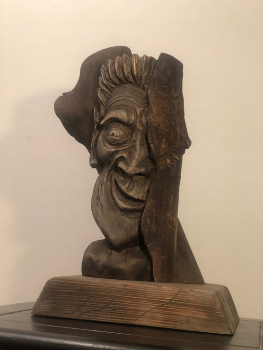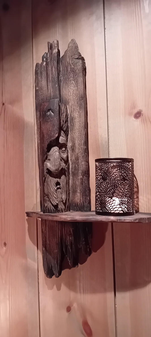 Eldarvoktr –Vegghylle av brent drivved med utskåret treånd.