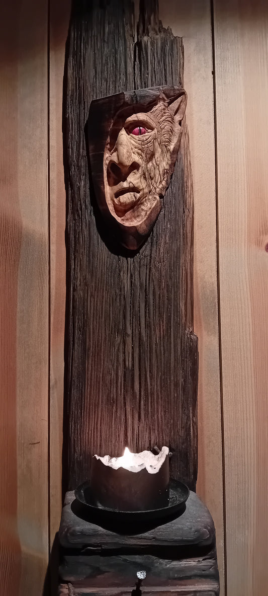 Myrkheimr: Vegghylle av drivved med utskåret treånd.