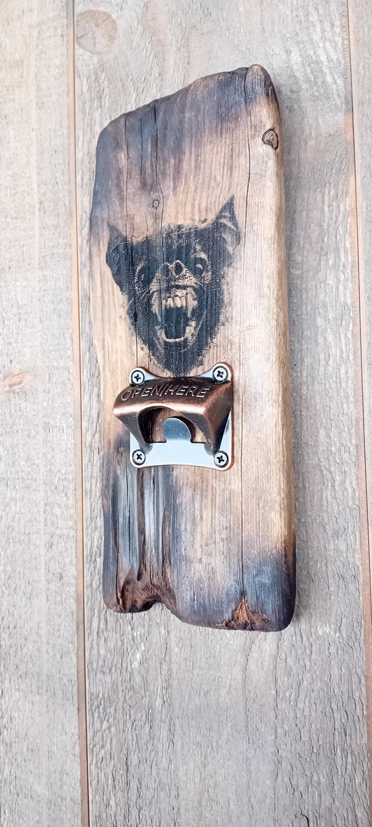 Vegghengt flaskeåpner av drivved med flaggermusmotiv