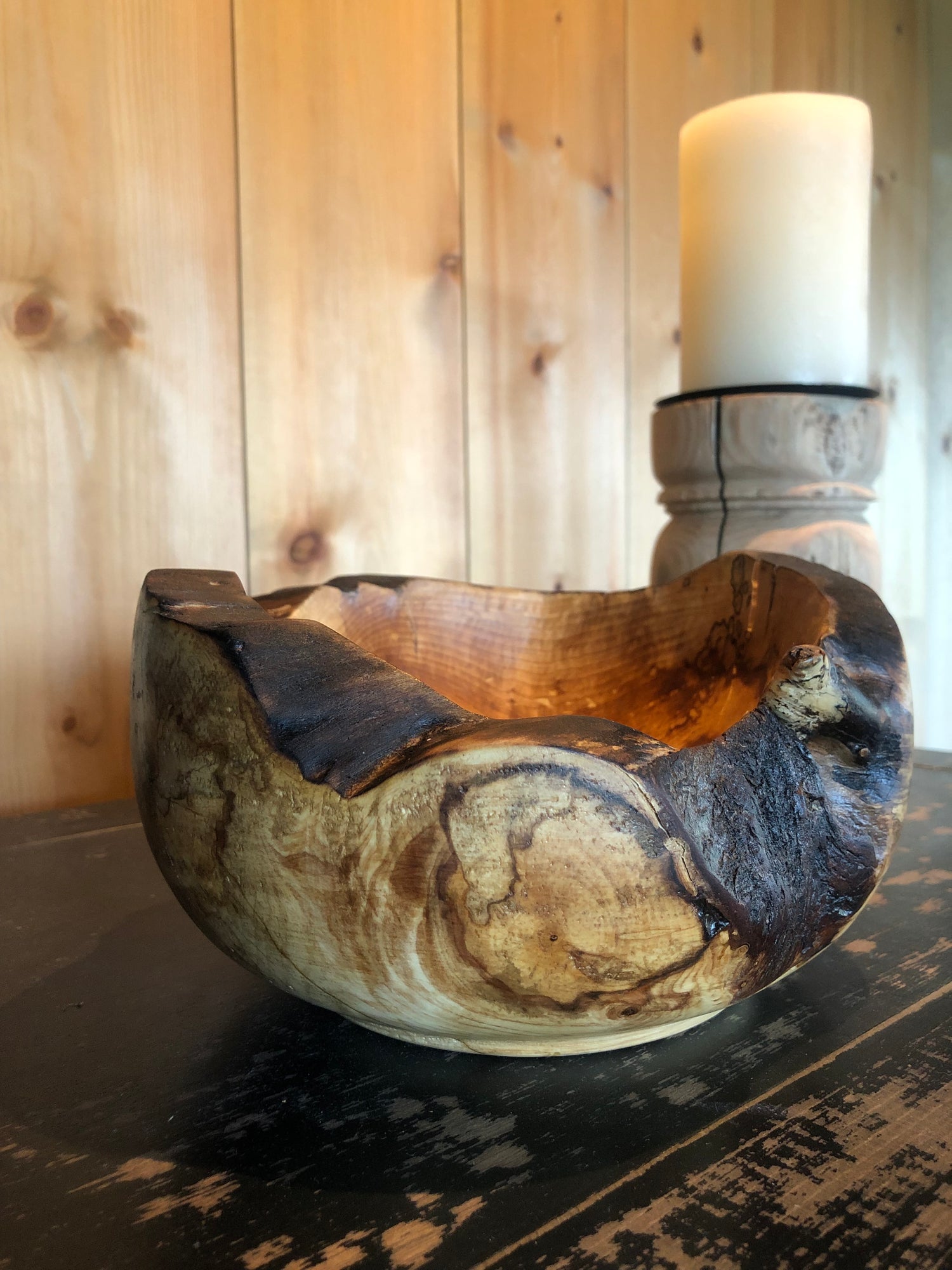 «Bjørkeknute» - Denne vakre bollen er laget av knutet eldet bjørk med markant spill og mønstre i treverket. Dreiet på tvers for å ivareta de naturlige organiske formene fra trestammen. Se flere bilder i Bildegalleri og Webshop.