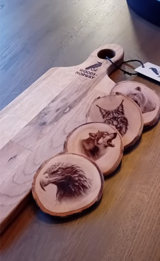 «Gravering» - Fra vårt spennende sortiment av rustikke skjærebrett og graverte villmarksbrikker håndlaget av høyfjellsbjørk fra Ustaoset. Her avbildet settet med Norske ville dyr.