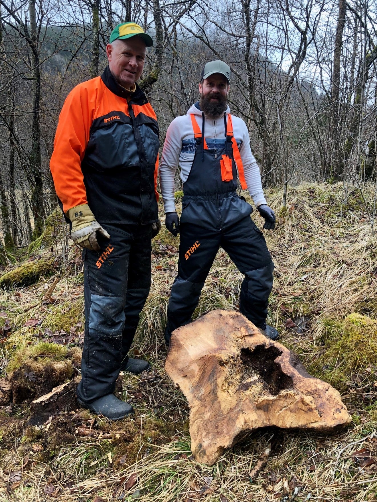 «Osterøy» - Her på emnesanking på Osterøy utenfor Bergen, der vi ved nødvendig tynning av skog har felt en gammel knutet bjørk og gått løs på den mest spennende delen av treet. Bjørkeroten er med sine fantastiske mønstre og fargespill selve «indrefileten». Her er det muligheter for å lage mye fint og unikt.
