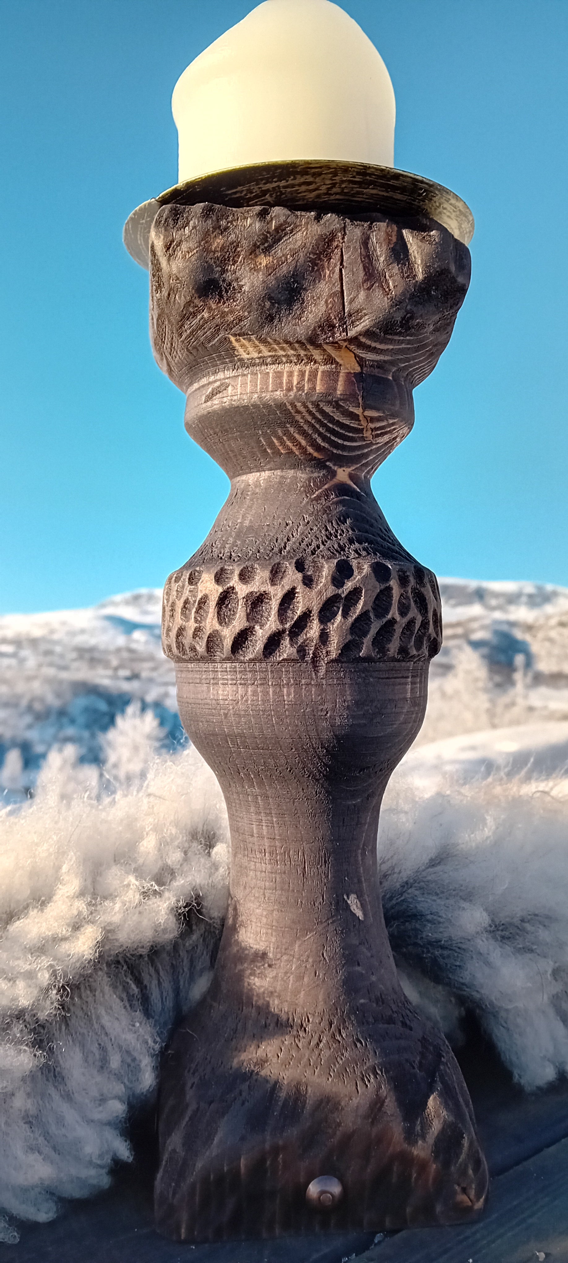 Dreid lysestake med håndskårede detaljer