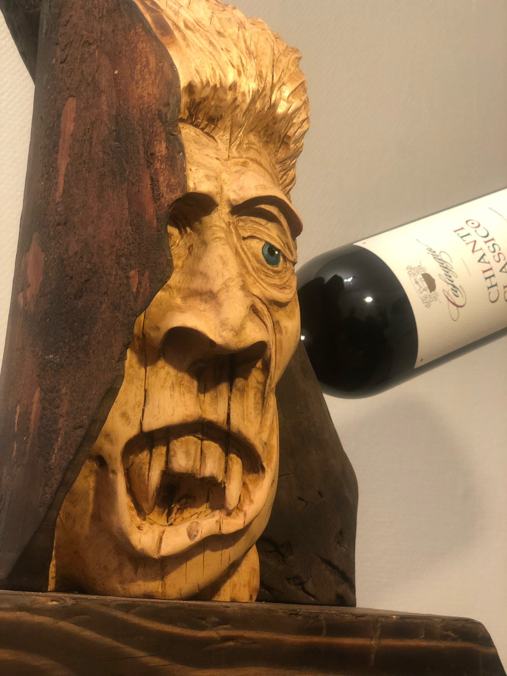 Men det som gjør dette vinstativet unikt, er den sjarmerende treånden Ivan, som er skåret ut av en gammel vedkubbe av bjørk. Ivan er ikke bare en dekorativ detalj; han er en sympatisk vampyr med et karakteristisk grønt øye som gir liv til vinstativet