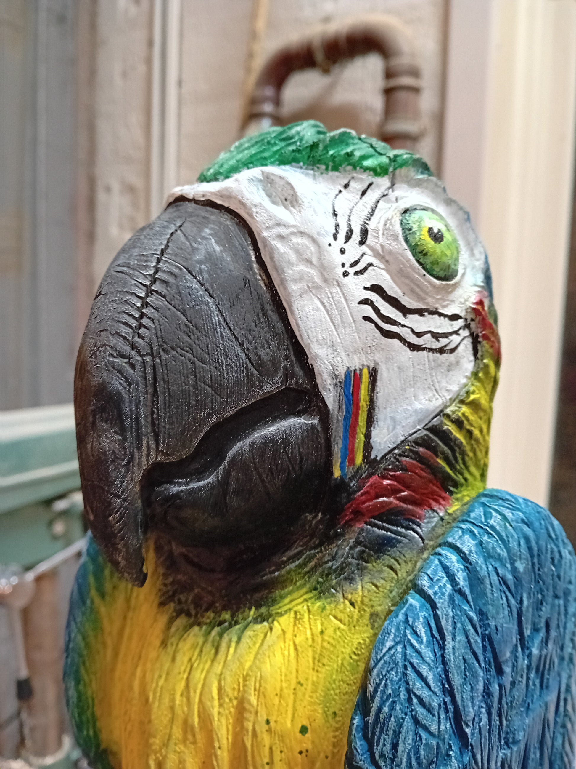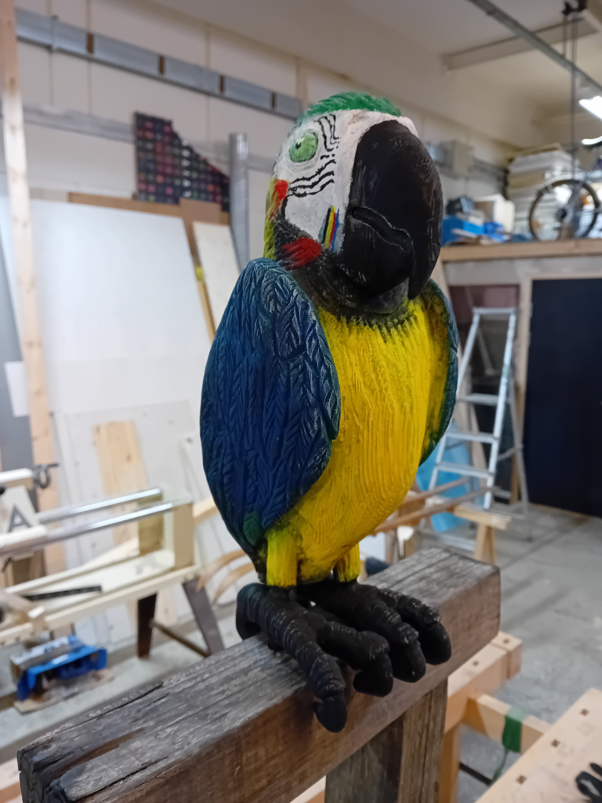 Oppdag skjønnheten i naturen med vår unike håndskårne pappegøye "Kaleido". Pappegøyen er nøye skåret ut med vinkelsliper, freseverktøy og detaljekniver, som gir presisjon og detaljrikdom i pappegøyen. Den levende fargepaletten og de intrikate mønstrene på fjær og kropp fanger øyet og gir et realistisk uttrykk som tar deg med til tropenes rike.