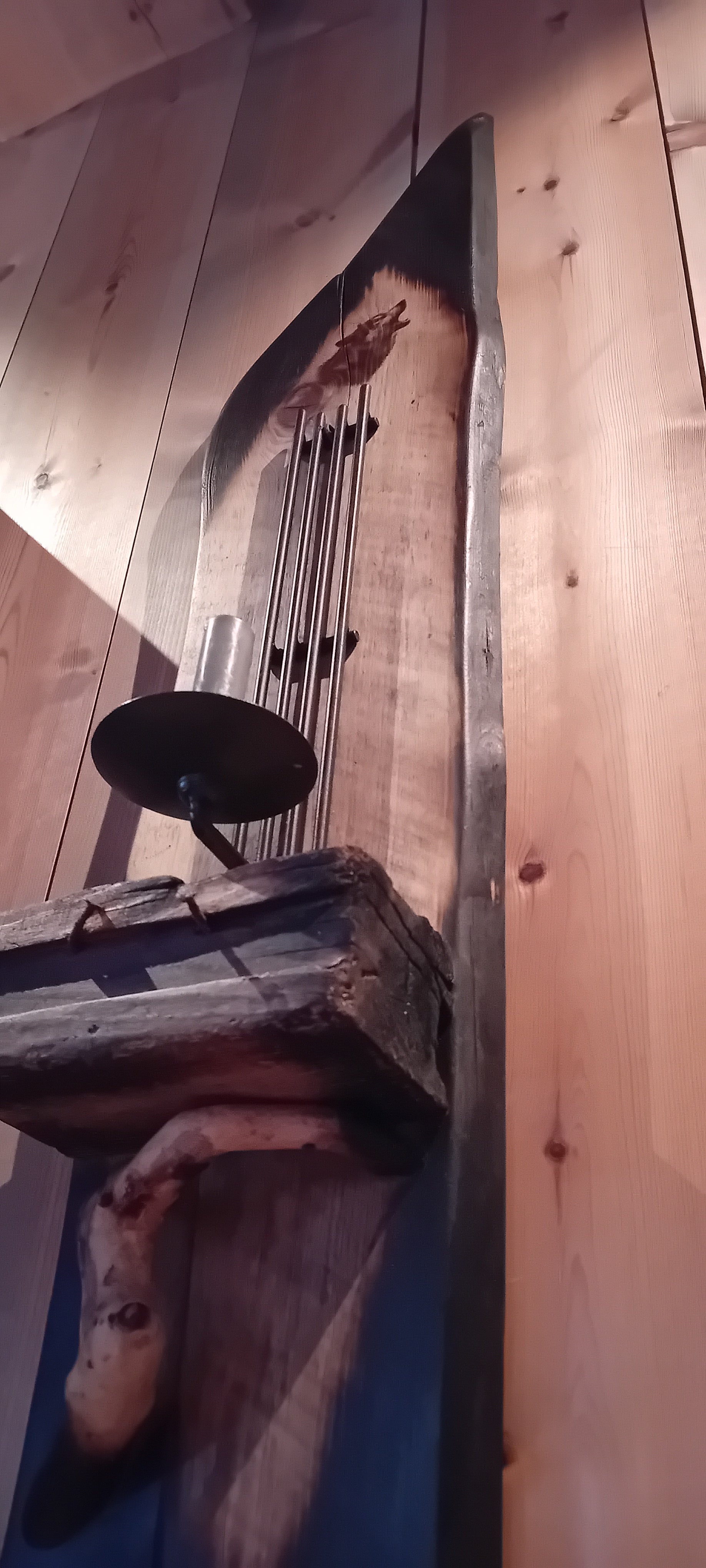 Som en ekstra detalj finner du en rustikk pyntehylle laget av drivved, med synlige rustne spikre som binder sammen naturens rå skjønnhet med et vintage touch. Denne hyllen gir ikke bare et praktisk sted å plassere lys eller små dekorasjoner, men fungerer også som en fantastisk bakgrunn for lyset som stråler nedover.