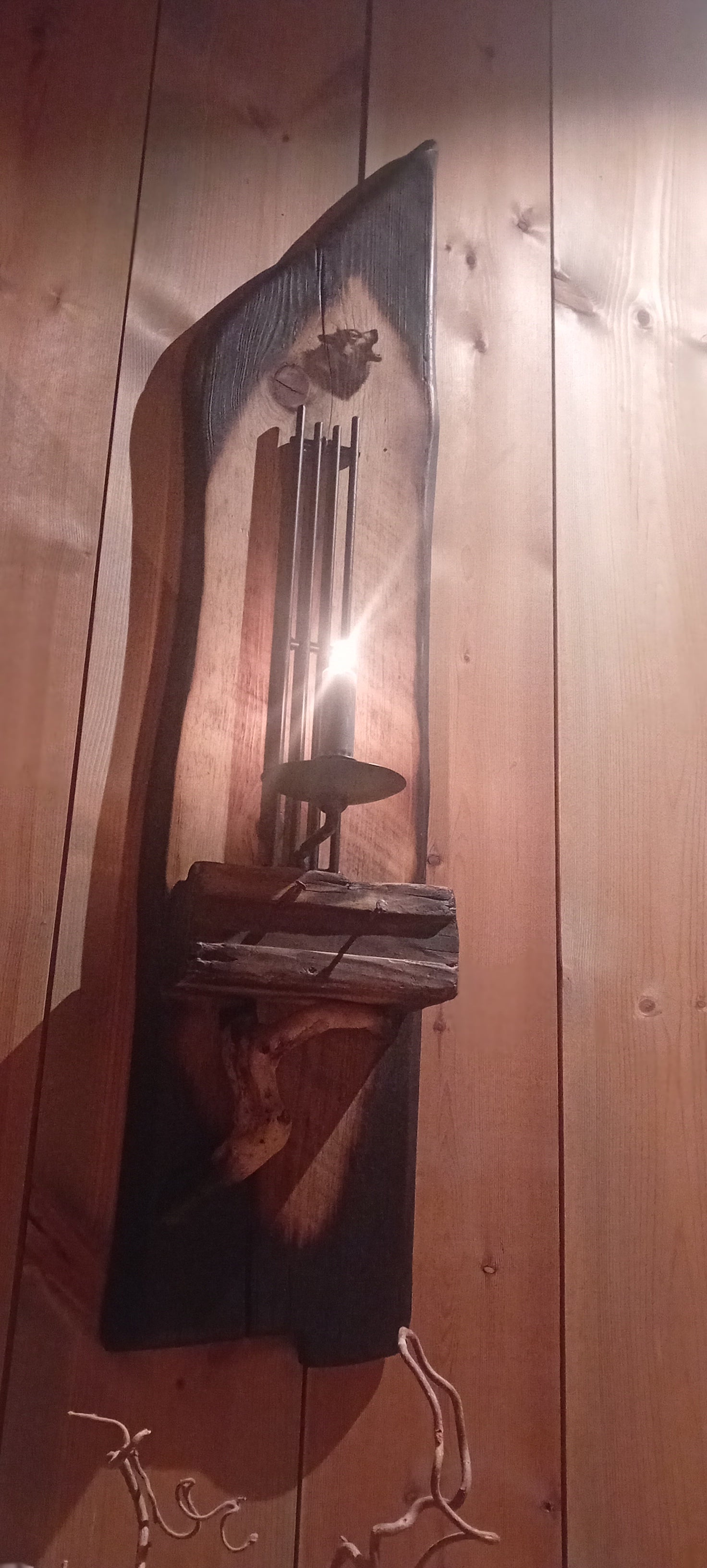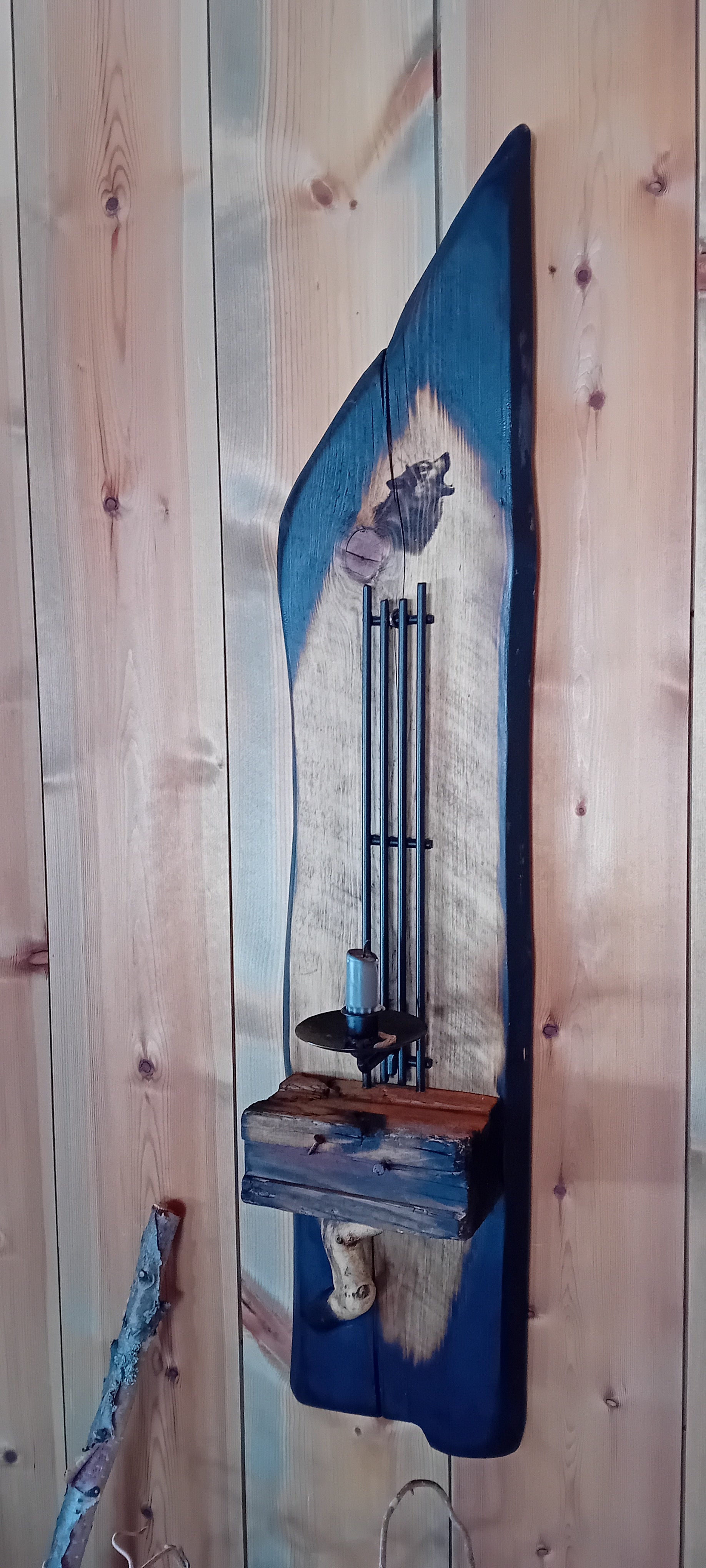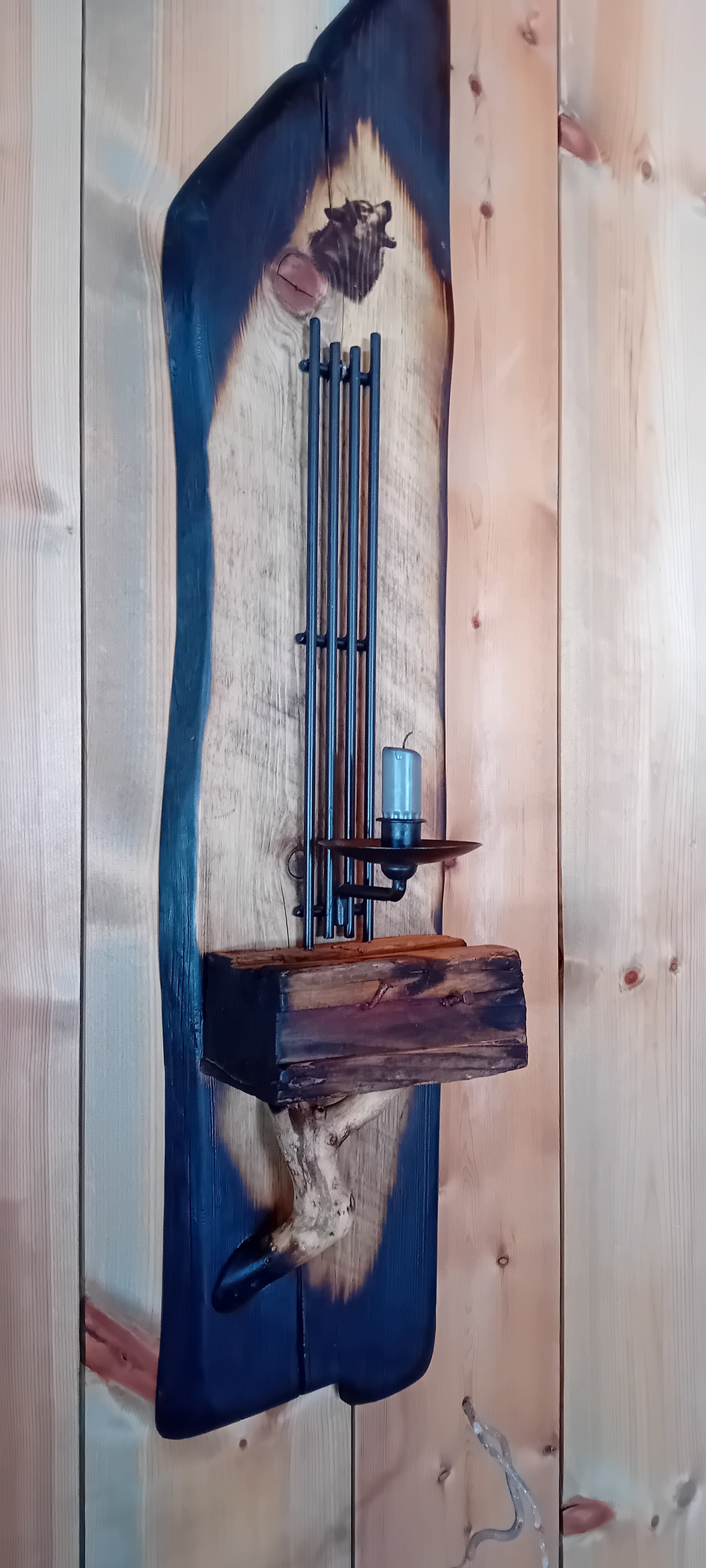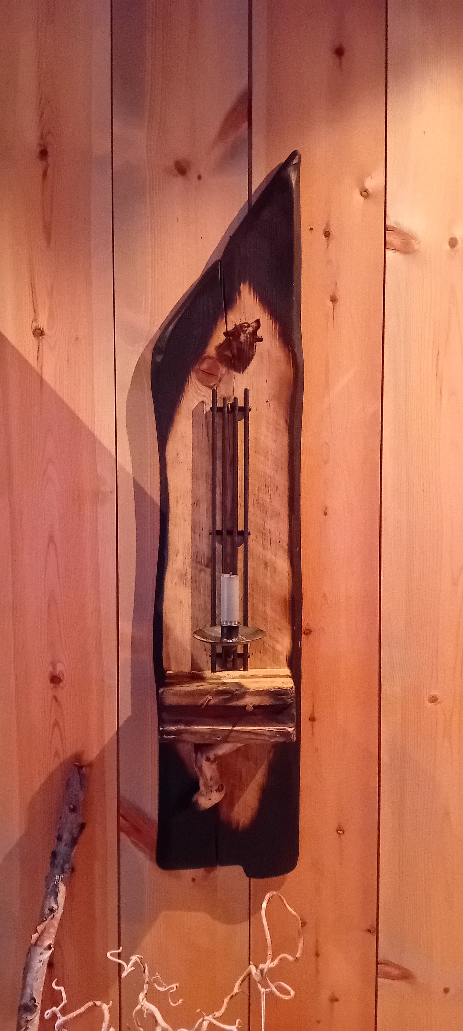 Rustikk vegglys av brent villmarkspanel med Ulvemotiv