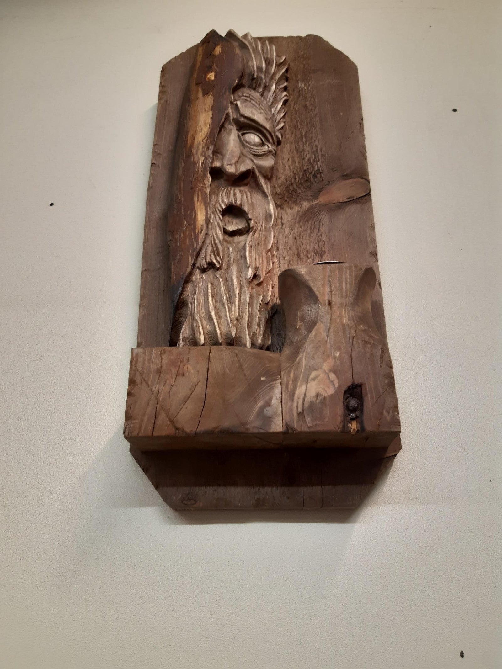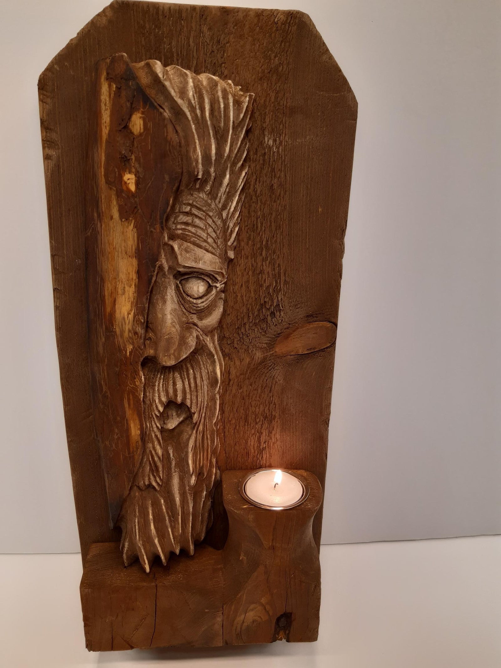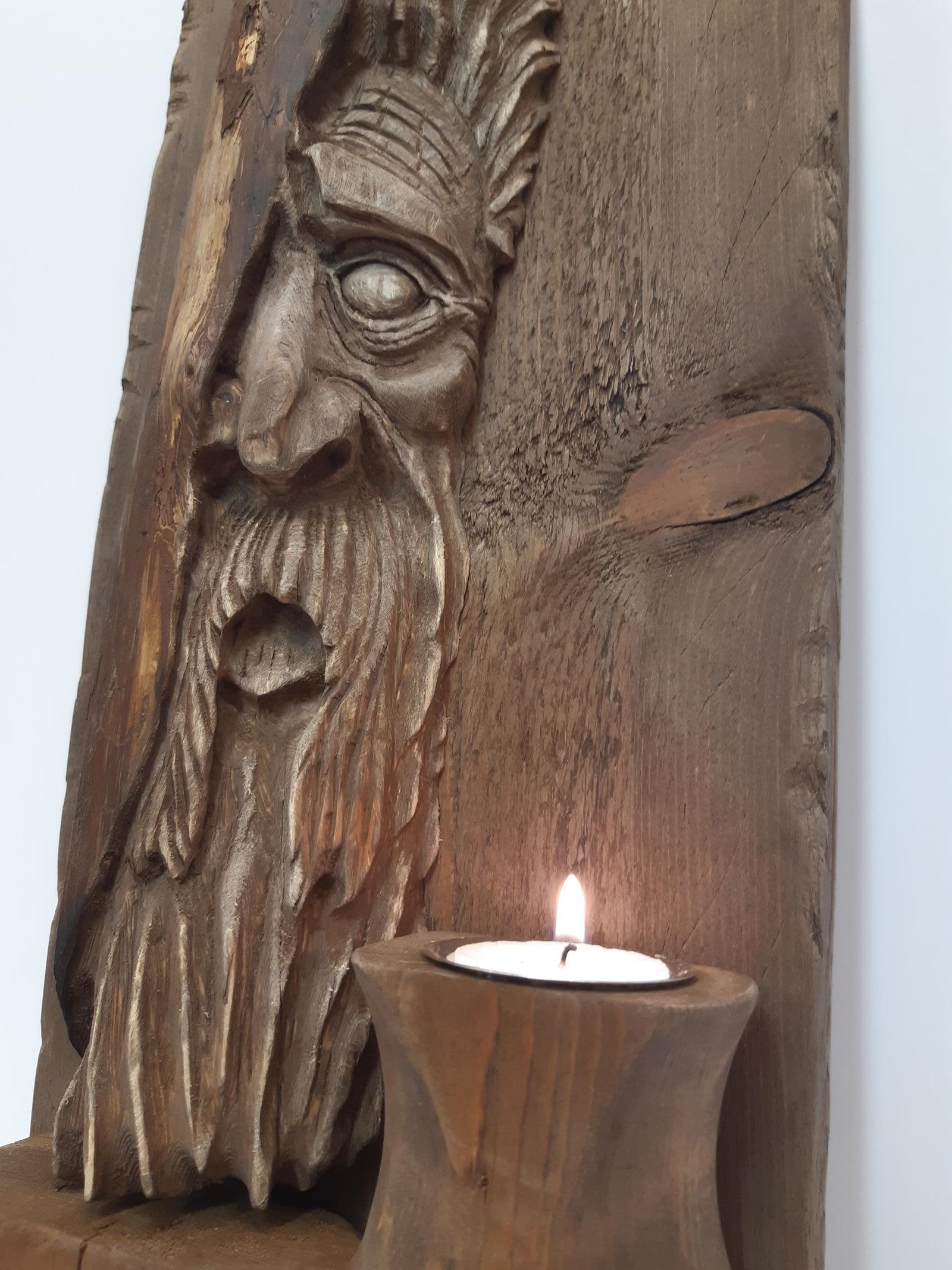 Ved siden av Tormod finner du en liten, rustikk drivvedshylle med integrert telysholder. Hele dekorasjonen er beiset i en varm valnøttfarge, som fremhever treets naturlige skjønnhet og gir en dyp, rik tone.